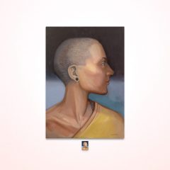 A portrait of Noor. Her figure is displaced to the left making one half positioned left and the other hald to the right side of the painted area. A second smaller painting depicts her silhouette in the correct way in the middle.